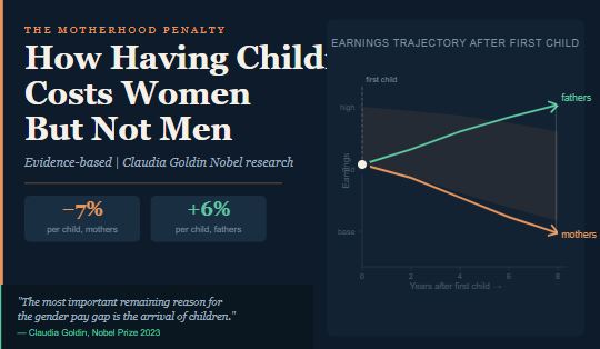 Goldin’s landmark work traced women’s labor force participation across more than a century of American history, identifying what she called the “career-family gap” as the central remaining driver of the gender pay gap. Her research demonstrated that the earnings trajectories of men and women run nearly parallel until the arrival of a first child β at which point they diverge sharply, and largely do not reconverge. This is the motherhood penalty: a measurable, durable, and compounding reduction in earnings, career advancement, and economic security that falls almost exclusively on mothers.
